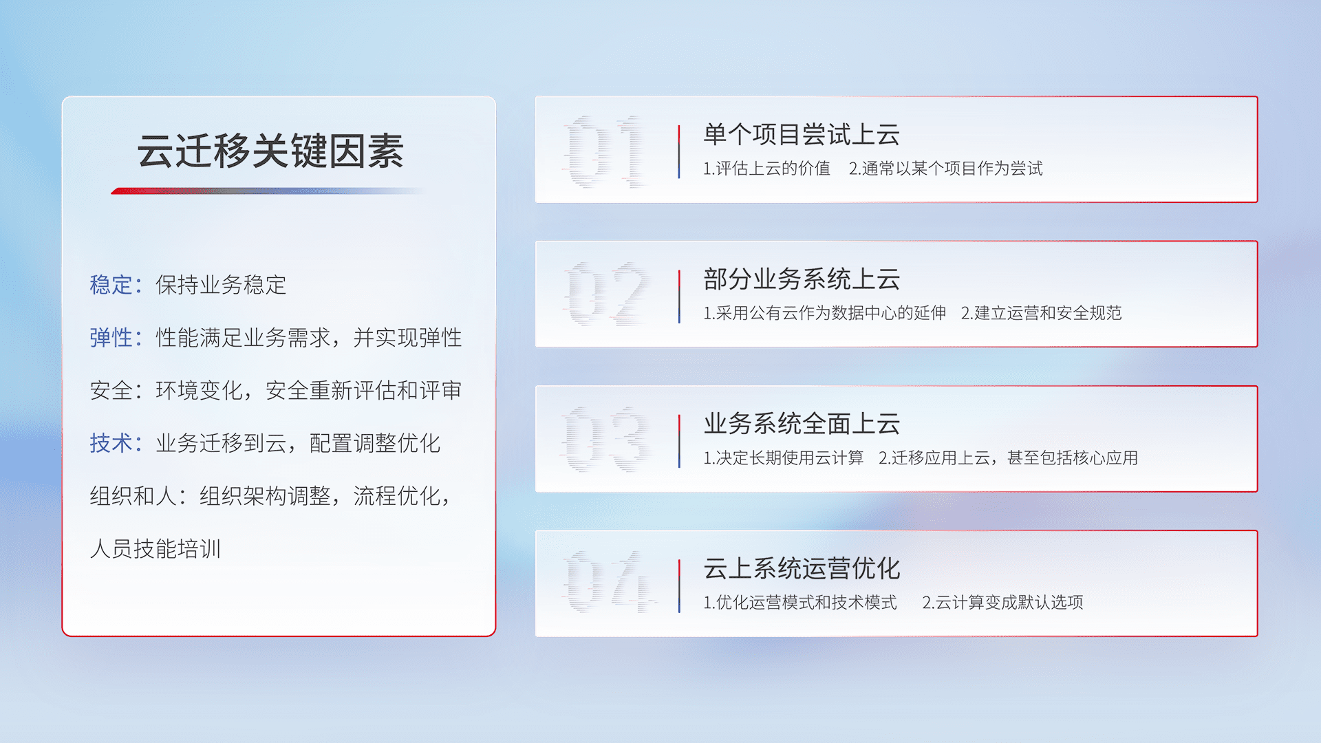 结合实际业务,,,从规划设计、、、、云平台选型、、、、云原生改造、、、数据迁移、、、集成交付,,,迁移全过程为客户识别最佳上云路径,,做好风险识别管理,,,,设计网络架构、、、、身份权限、、、安全审计合规、、、操作审计、、、日志审计、、、监控告警策略、、、、多站点容灾设计等,,,对云上基础设施进行整体规划,,提升IT治理水平,,以满足弹性、、、、高可用、、、、高性能的需求。。