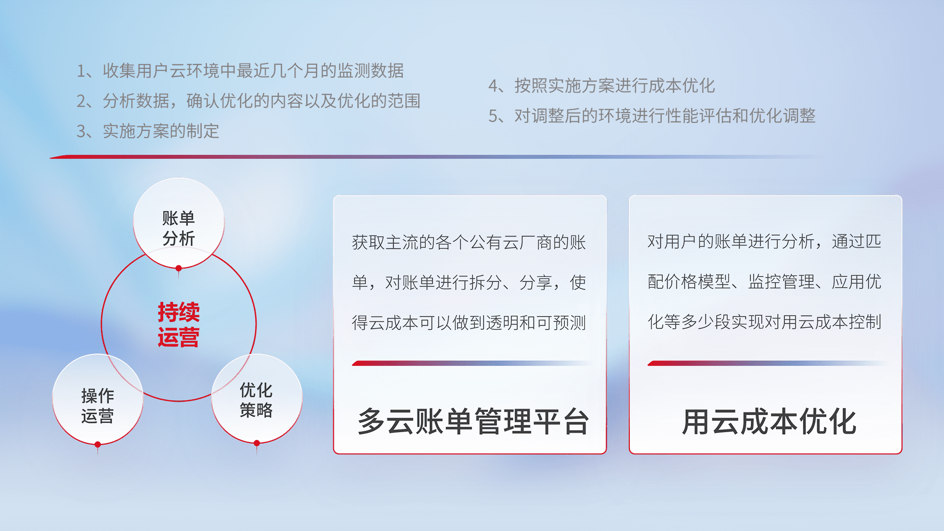通过多云纳管,,,,以统一的资源数据模型把客户的云资源进行抽象和封装,,,,进而实现对多云资源的统一操作,,,保障云资源管理的可靠性、、稳定性与可用性。。。。量身定制化运维内容,,,配置、、、开发运维、、、补丁管理、、、备份、、、、监控、、、认证和访问管理、、审计和日常巡检等,,保障在用云过程中的可靠度,,,,稳定度以及高可用率。。